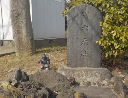 参道の入口に第六天社の石碑と小さな狛犬、庚申塔があります。