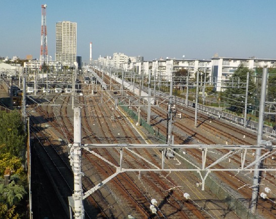 栗六陸橋から竹ノ塚駅方面には、日比谷線の車両基地(千住検車区竹ノ塚分室)が見えます。