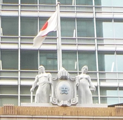 正面屋上には小倉右一郎作の二つの人像がおかれ、男性はハンマー、女性は糸巻きを手にして当時の二代工業だる鉱業と紡績業を示している」