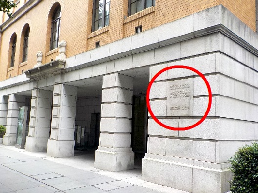 三菱UFJ信託銀行本店の南側、大名小路に面する壁面に石のプレート「電話交換創始之地」があります。