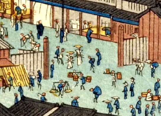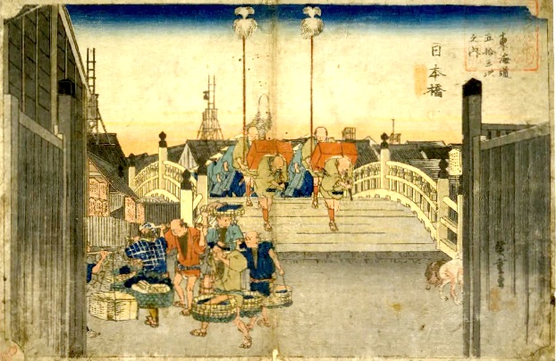 挿絵右下に、橋詰から日本橋魚市入口が見えます。