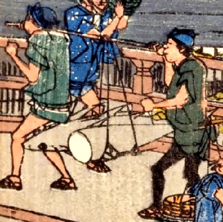 日本橋の中央には、マグロ2匹を天秤棒でかついだ人が描かれています。