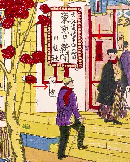 明治10年に日報社を退社した岸田吟香が描かれているので、明治10年の作品と推定します。