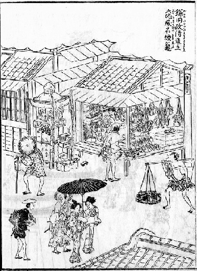 辻に立つ「六地蔵石燈籠」が描かれています。