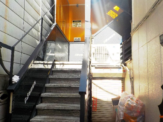 店の入口は、裏から階段を上がります。